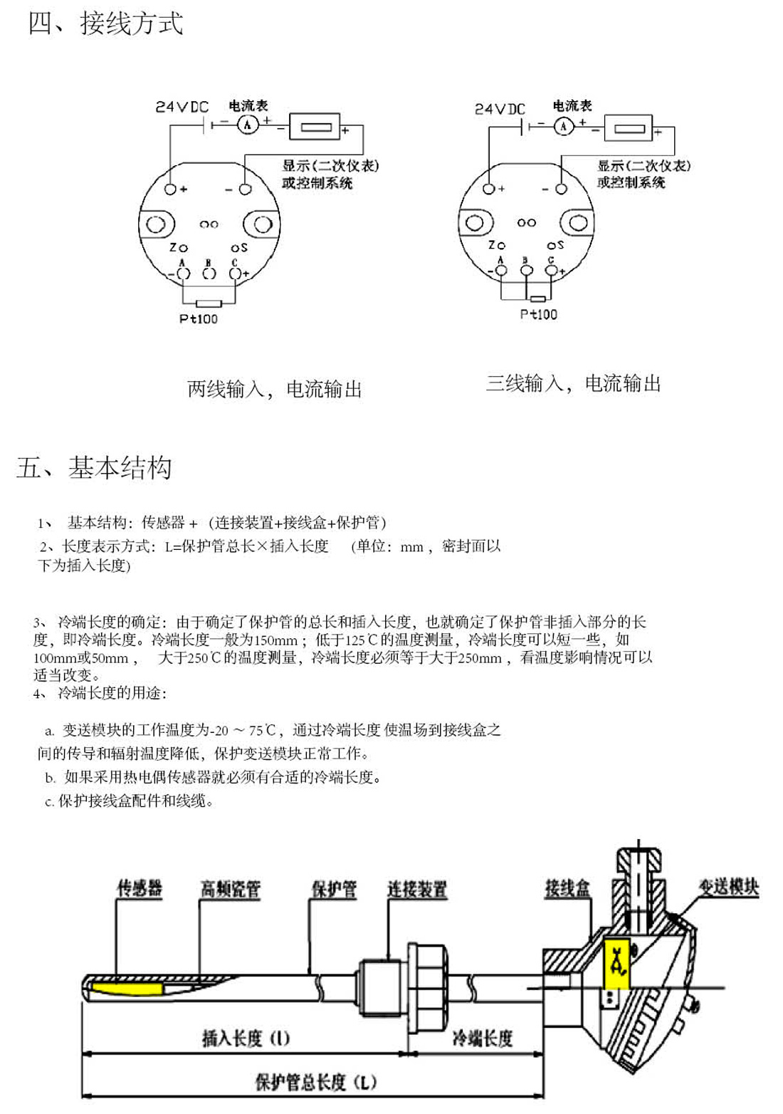 JDWZP系列一體化溫度變送器由測(cè)溫探頭、溫度轉(zhuǎn)換模塊、保護(hù)外殼三部分組成。測(cè)溫探頭采用高阻型Pt100鉑電阻,通過(guò)內(nèi)部轉(zhuǎn)換模塊的穩(wěn)壓濾波、運(yùn)算放大、非線性校正、V/I 轉(zhuǎn)換、恒流及電源反接保護(hù)等電路處理后, 轉(zhuǎn)換成與溫度成線性關(guān)系的電信號(hào)輸出,產(chǎn)品廣泛應(yīng)用于石化、電力、冶金、醫(yī)藥、食品等工業(yè)領(lǐng)域的測(cè)溫過(guò)程控 制,配合儀表或 PLC 組成計(jì)算機(jī)集散測(cè)控系統(tǒng)。