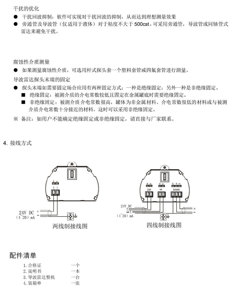 JDRD811型導(dǎo)波雷達(dá)是基于TDR時(shí)域反射原理的一種接觸式物位測(cè)量?jī)x表。導(dǎo)波雷達(dá)波發(fā)出的 高頻微波脈沖以光速沿著探測(cè)組件(鋼纜或鋼棒)傳播,當(dāng)脈沖遇到物料表面時(shí),由于介電常數(shù)εr與空氣不同,介電常數(shù)突變,就會(huì)產(chǎn)生反射,并被儀表接收器接收。 智能軟件對(duì)正確的回波識(shí)別后,通過微處理器精確控制和計(jì)算脈沖運(yùn)行時(shí)間并被轉(zhuǎn)換成 與距離成正比的4-20mA信號(hào),精度可達(dá)毫米級(jí)。