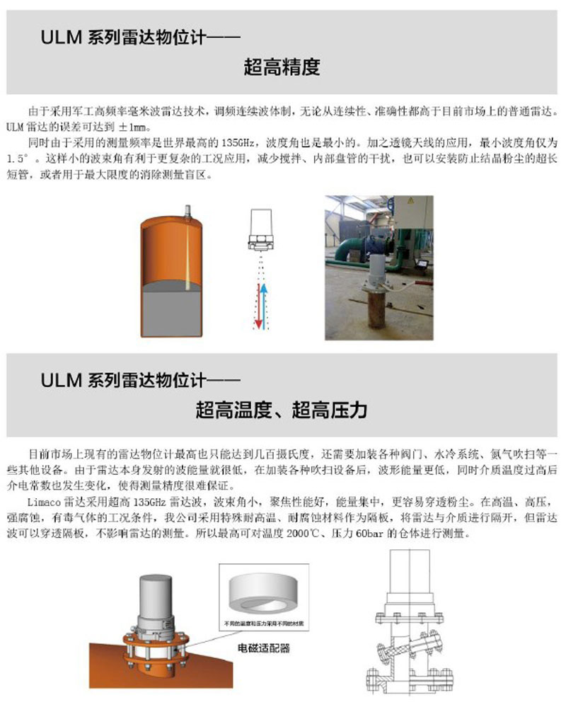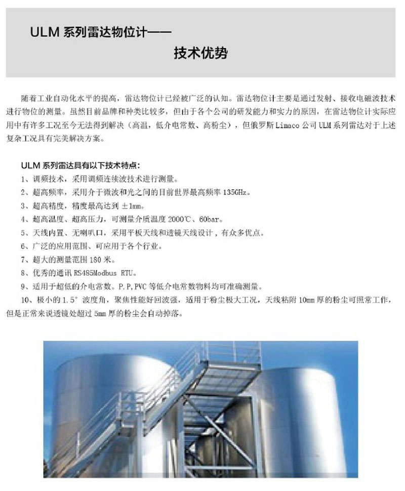 利馬克ULM 系列雷達(dá)物位計(jì)是俄羅斯利馬克公司生產(chǎn)的物位測(cè)量?jī)x表,是工作頻率為140GHz的雷達(dá)物位計(jì)。ULM 系列雷達(dá)物位計(jì)在研發(fā)中采用了很多的高新技術(shù),在軍事雷達(dá)技術(shù)的基礎(chǔ)上轉(zhuǎn)化為工業(yè)雷達(dá)技術(shù)的測(cè)量?jī)x表,擁有優(yōu)越的技術(shù)性能和應(yīng)